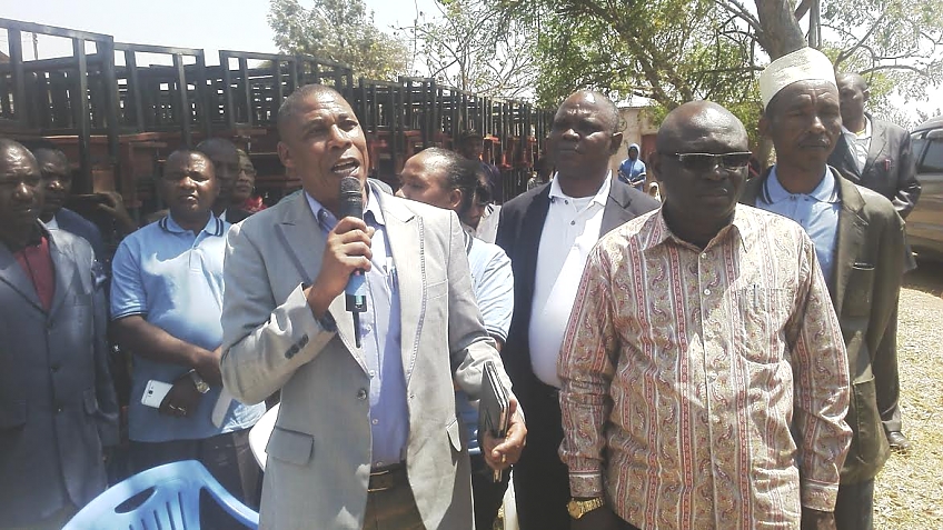 Mwenyekiti wa Halmashauri ya Wilaya ya Singida Eliya Digha akimshukuru Mkuu wa Mkoa wa Singida Mathew J. Mtigumwe (aliyevaa miwani) mara baada ya kuyapokea madawati hayo yaliyotolewa na asasi ya WAENDELEE, katikati yao ni Mwenyekiti wa asasi hiyo Bw. Joseph J. Kijeruda.